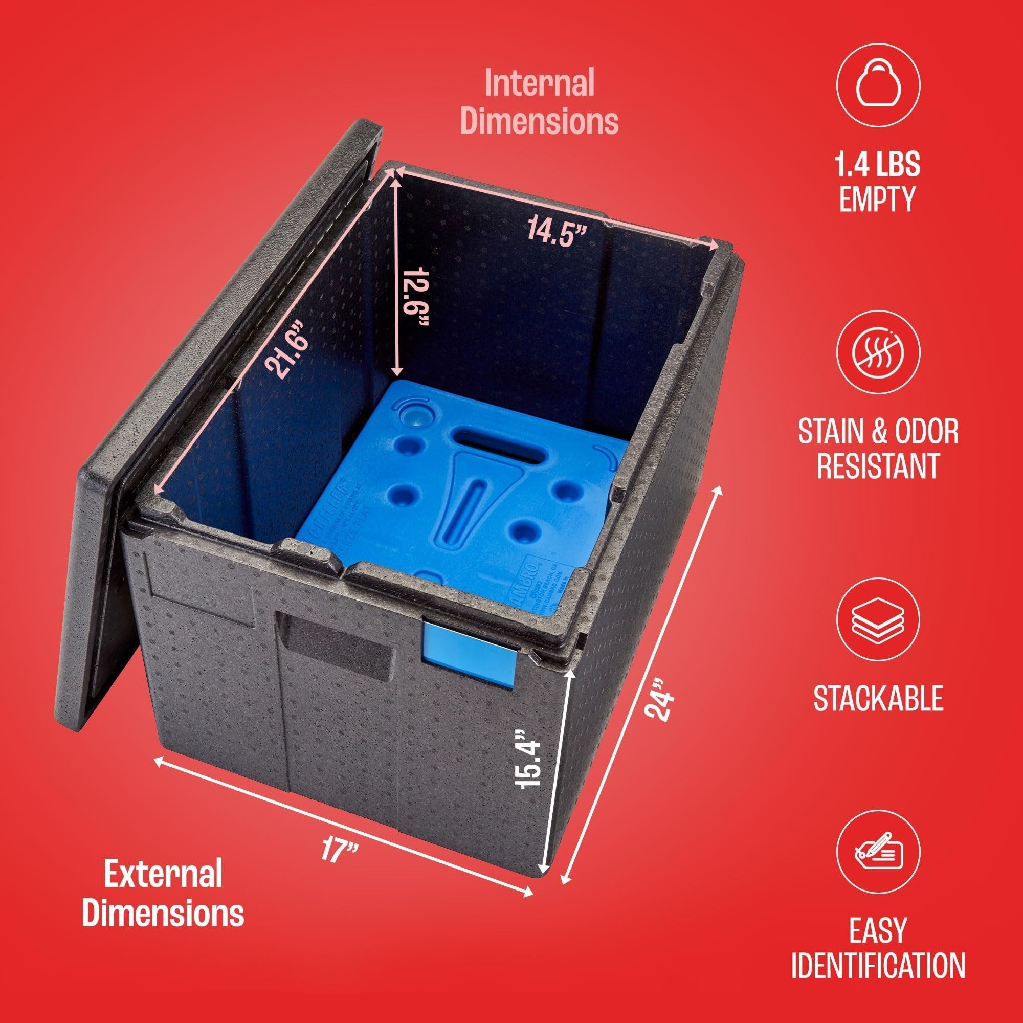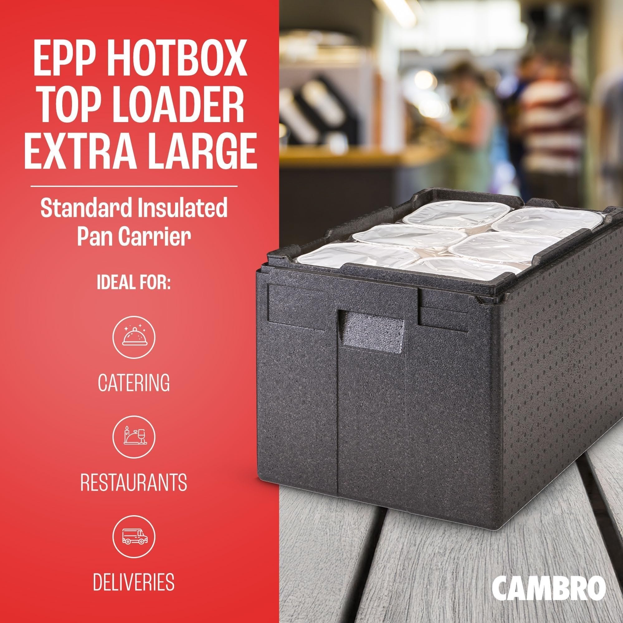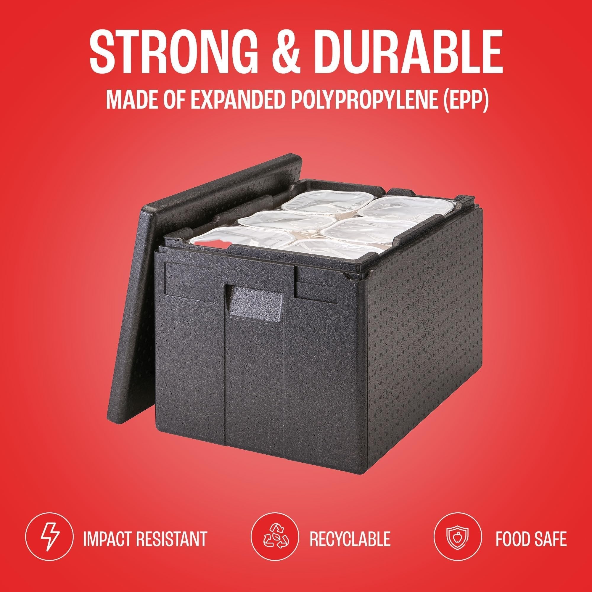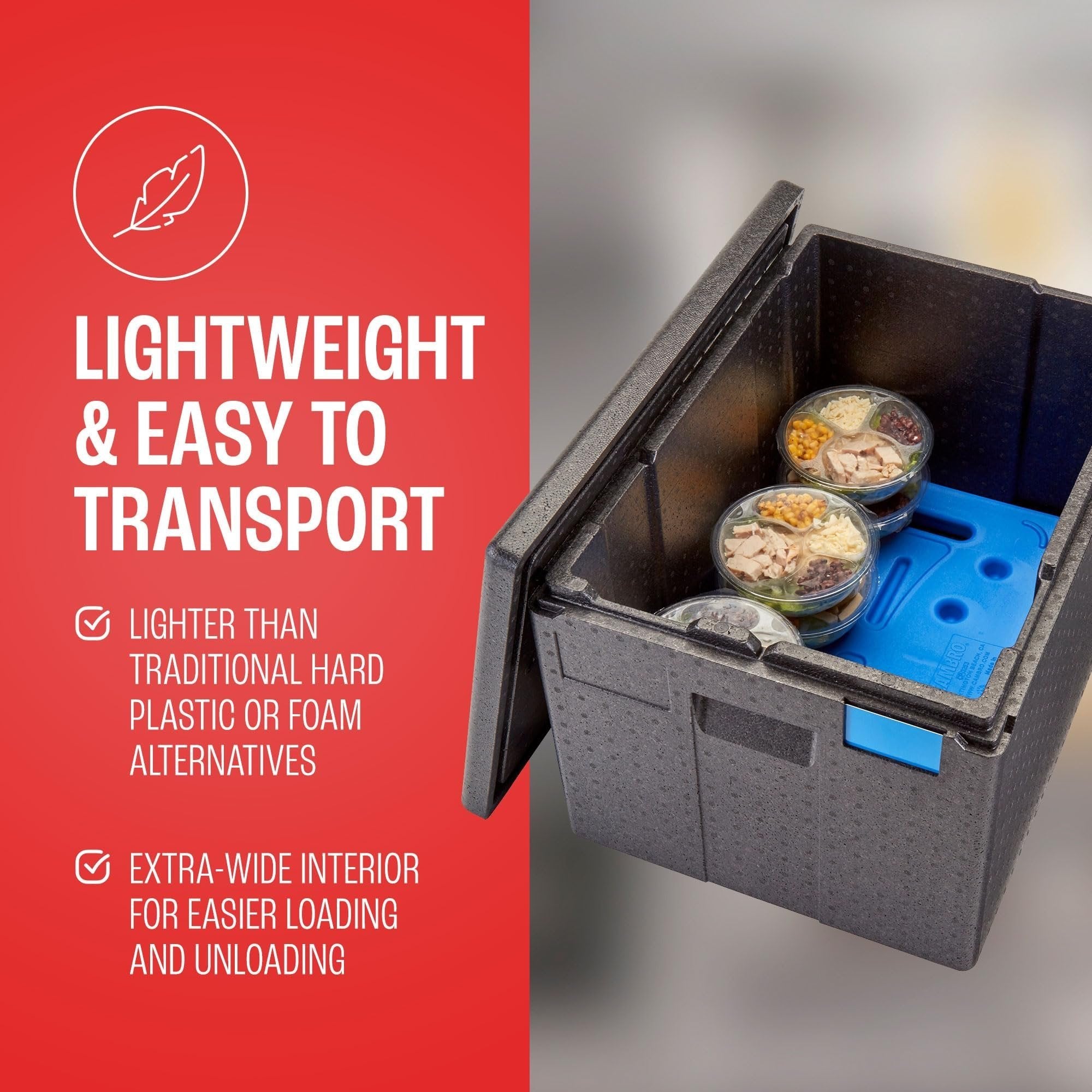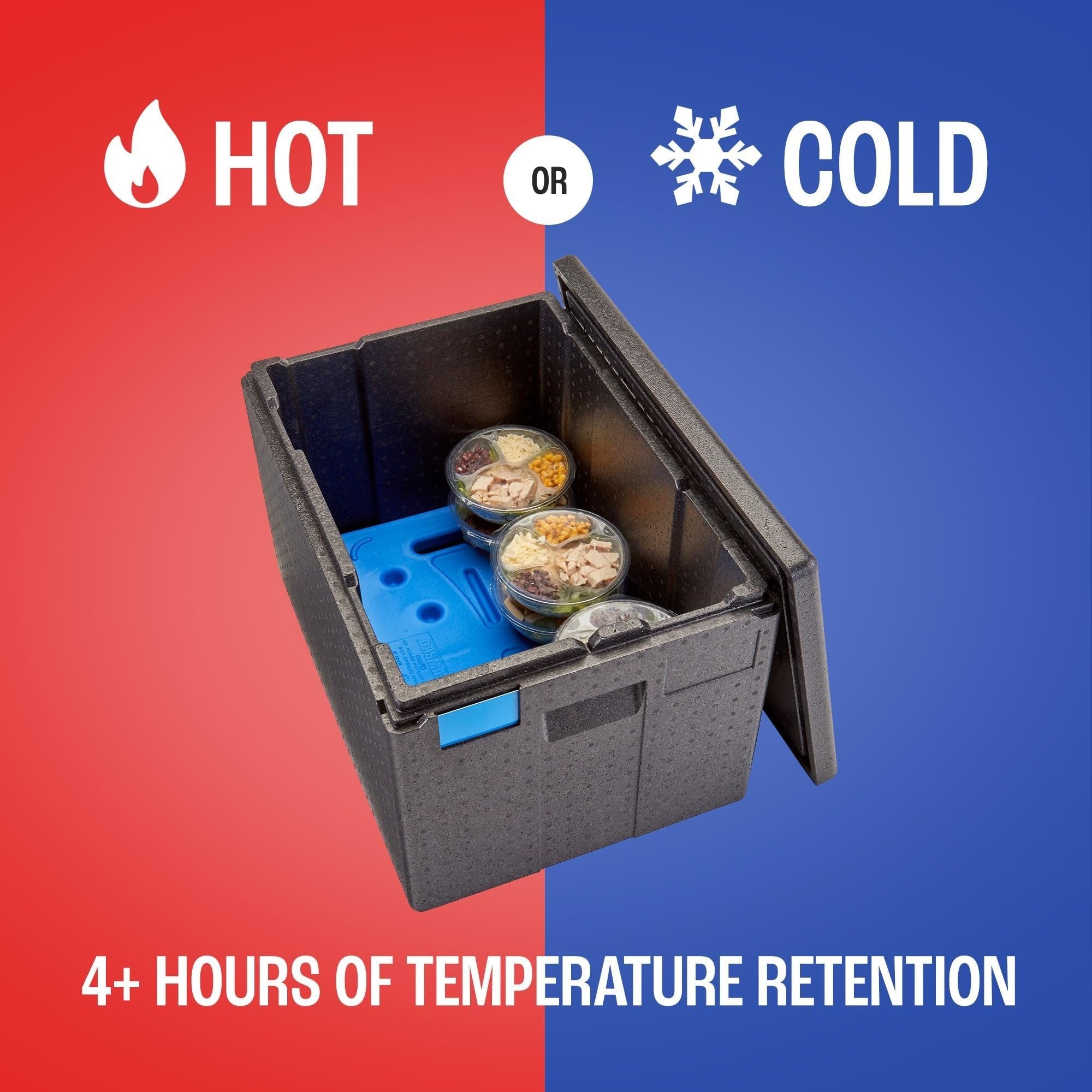 Cambro GoBox Insulated Lightweight Thermal Hot Box and Food Pan Carrier (12 Inch Deep) - Hotbox and Food Warmer for Catering & Transport - Top Load (Gray)THERMAL FOOD CONTAINER: Made from heat-retaining expanded polypropylene, this carrier keeps your food hot for over 4 hours without any electricity. Perfect for keeping food warm on the go, ensuring your dishes stay hot and ready to eat once they have arrived to their destination.VERSATILE PAN COMPATIBILITY: Easily slide in your dishes with its convenient built-in rails, perfect for carrying casseroles, hotel pans, aluminum, stainless steel chafer pans, and steam table pans.SERVE DIRECTLY FROM THE BOX: Not just for transport, this versatile hot box allows you to hold food at the service site and serve directly to customers. Ideal for catering businesses, food trucks, BBQ enthusiasts, and event organizers looking to streamline service and maintain food quality on-site.FOOD SAFETY: Avoid the 'Danger Zone' with our thermal carrier, expertly designed to keep food safely above or below critical temperatures. This ensures your dishes remain safe from bacterial growth, giving you peace of mind whether you're catering an event or transporting meals.EASY TO TRANSPORT: This commercial grade carrier is built to last yet is surprisingly lightweight. At just 3lbs empty, it makes carrying and transportaion easy.EASY TO CLEAN: This pan carrier stays clean and fresh, resisting stains and odors. Spills and food messes wipe away in seconds, ensuring easy upkeep during and after use. Plus, it's dishwasher safe for hassle-free cleaning.SLEEK & STRONG: Features a sleek design that catches the eye while being incredibly sturdy, maintaining its shape under heavy loads.