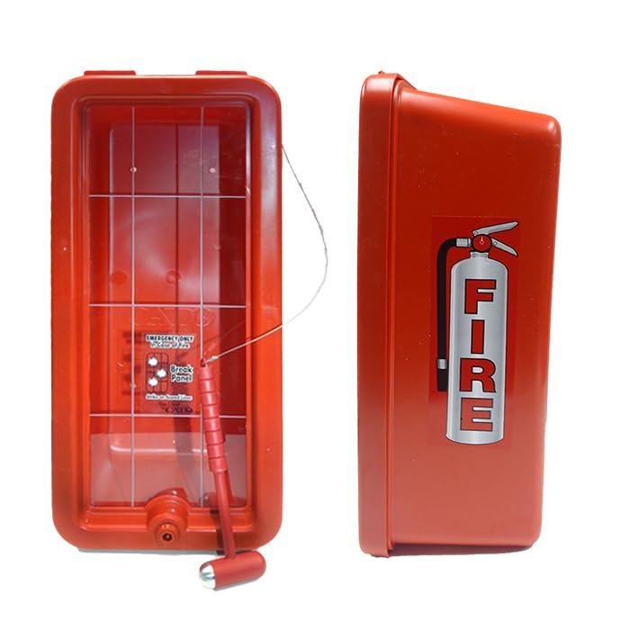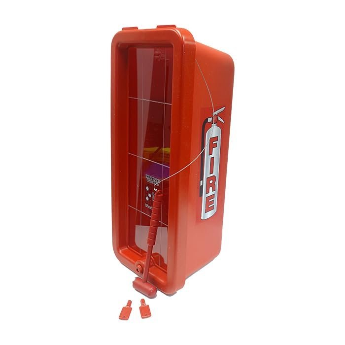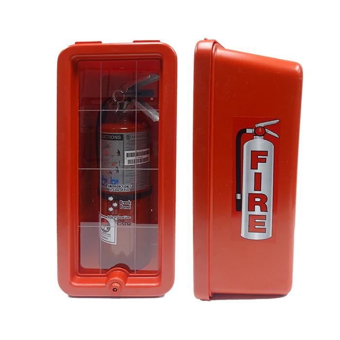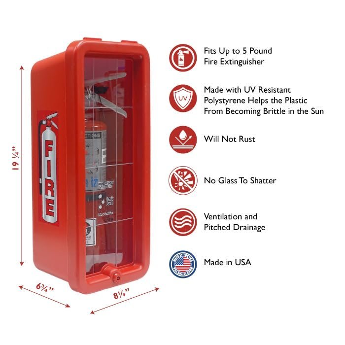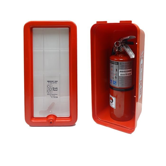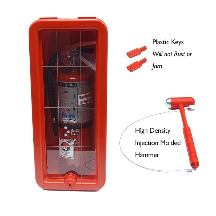 Cato 10551-H Red Plastic Chief Fire Extinguisher Cabinet for 2-1/2 or 5 lb. Extinguisher, with Hammer and Cylinder LockHOLDS 2.5 – 5 LB FIRE EXTINGUISHERS: Securely stores ABC fire extinguishers, protecting them from weather, rust, vandalism, and tampering while ensuring quick emergency access.RUST-PROOF & DENT-PROOF: Made from injection-molded high-impact polystyrene with UV inhibitors, preventing corrosion, dents, fading, and chipping—ideal for indoor and outdoor use.SECURE WITH EASY EMERGENCY ACCESS: Features an ABS cam lock with two keys for security and a grid-scored break panel for fast access. Includes high-density injection-molded hammer for added convenience.DURABLE & SAFETY-FOCUSED DESIGN: No sharp corners, no glass to shatter, and no padlock required—providing a safer, low-maintenance solution for commercial and industrial fire extinguisher storage.WALL-MOUNTED & WEATHER RESISTANT: Designed for easy installation with natural ventilation and pitched drainage, preventing moisture buildup. Made in the USA for superior quality and reliability.