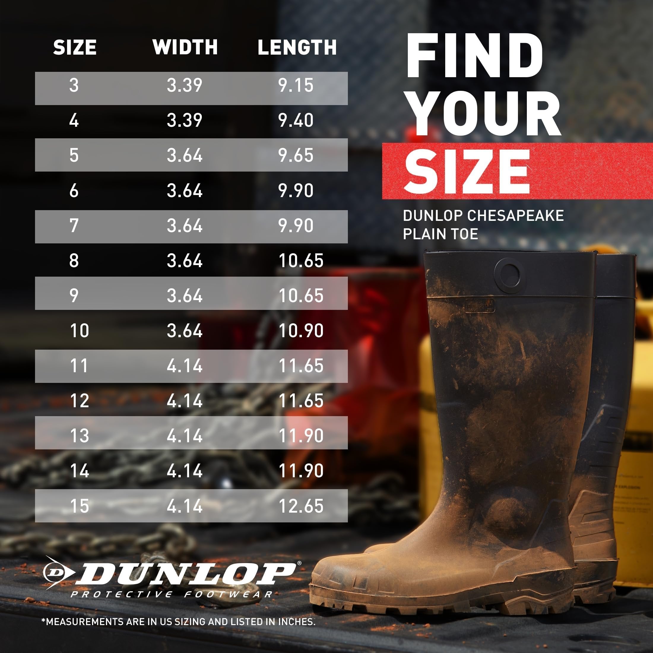 DUNLOP Protective Footwear, Chesapeake Plain Toe, 100% Waterproof, Lightweight and Durable PVC Boots, Slip Resistant, 8677577.09, Size 9 US, BlackLIGHTWEIGHT: The Chesapeake boots are made to be lightweight, up to 25% lighter than classic PVC boots.WATERPROOF: These boots feature an energy absorbing BAY-LOC outsole with channels to repel water making them 100% waterproof.COMFORTABLE: Our boots are made to be both comfortable and durable. The boots also feature replaceable economy cushion insoles and a PVC outsole. A great boot for everyday use.APPLICATIONS: Our Chesapeake boots work well for heavy duty jobs including in orchards, vegetable fields, citrus groves, and agriculture. Please review our size charts in the image section to find the correct sizing. Made in the USA.DUNLOP PROTECTIVE FOOTWEAR: We are Dunlop Protective Footwear, the world’s leading manufacturer of protective footwear. In more than 75 countries worldwide, we provide comfortable and protective footwear for workers across multiple industries.