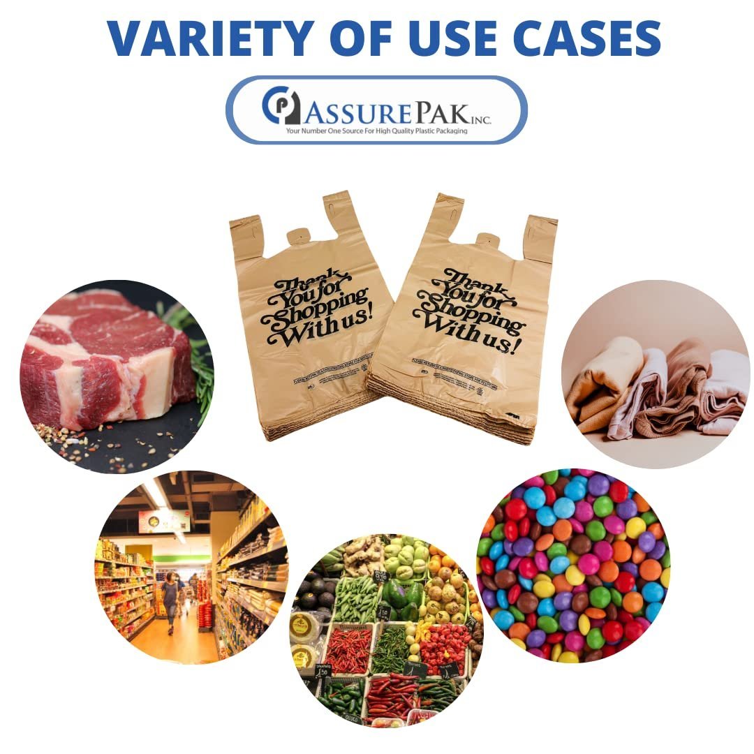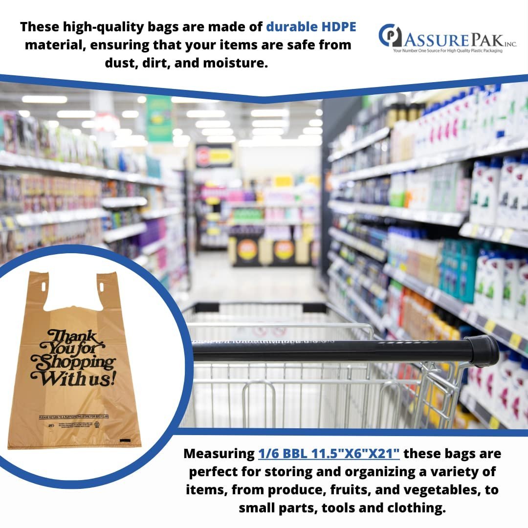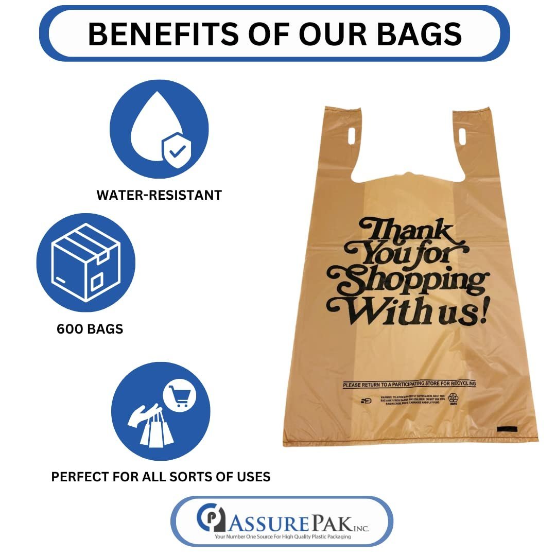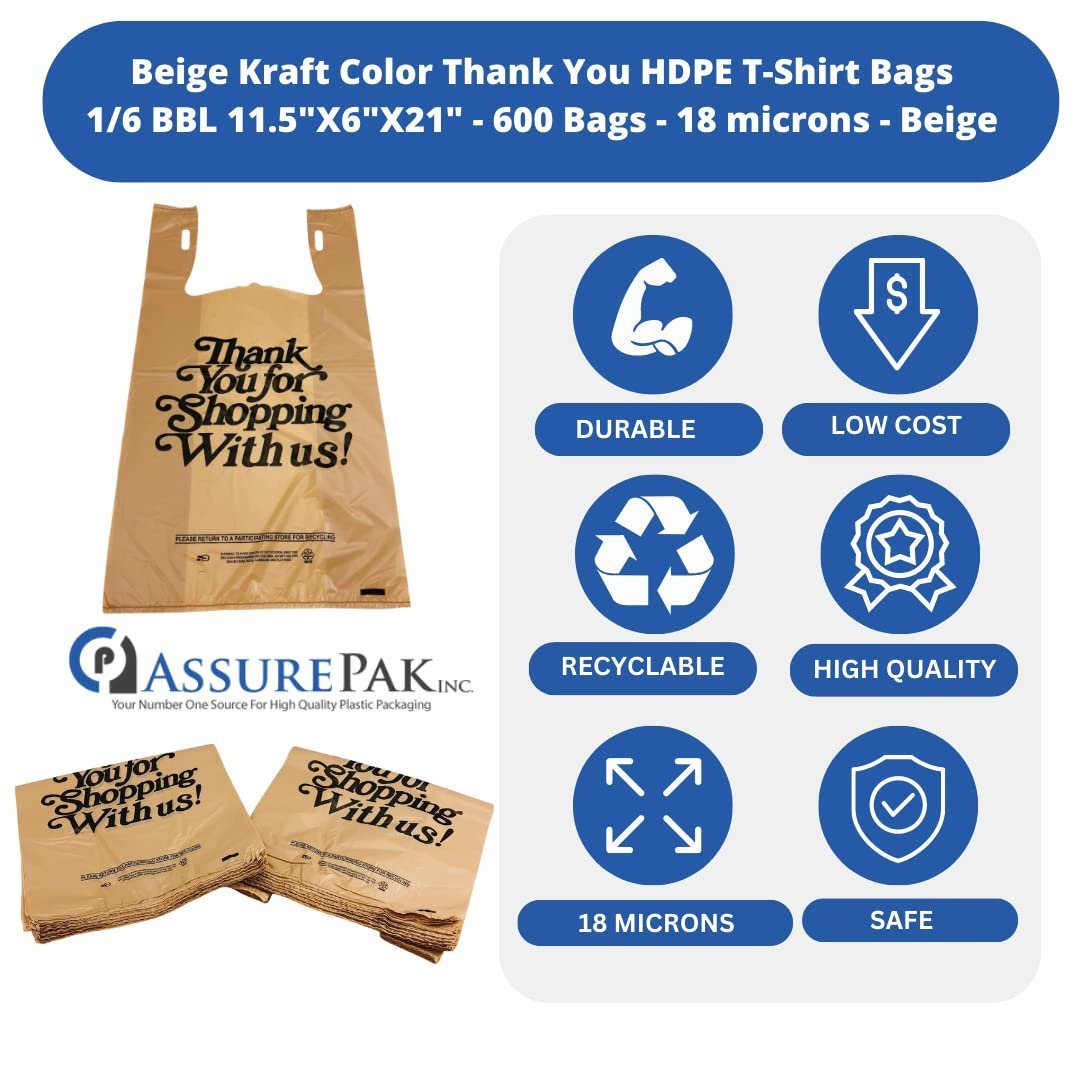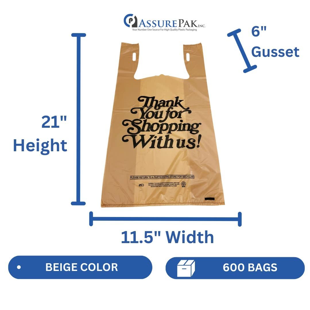 Easy Open Heavy Duty 'Thank You' Italic Print T-Shirt Plastic Bag for Retail, Groceries, Merchandise, Convenience Store, Supermarket, Restaurant - 11.5"x6.5"x21.5-600 Bags - 18 microns - Beige