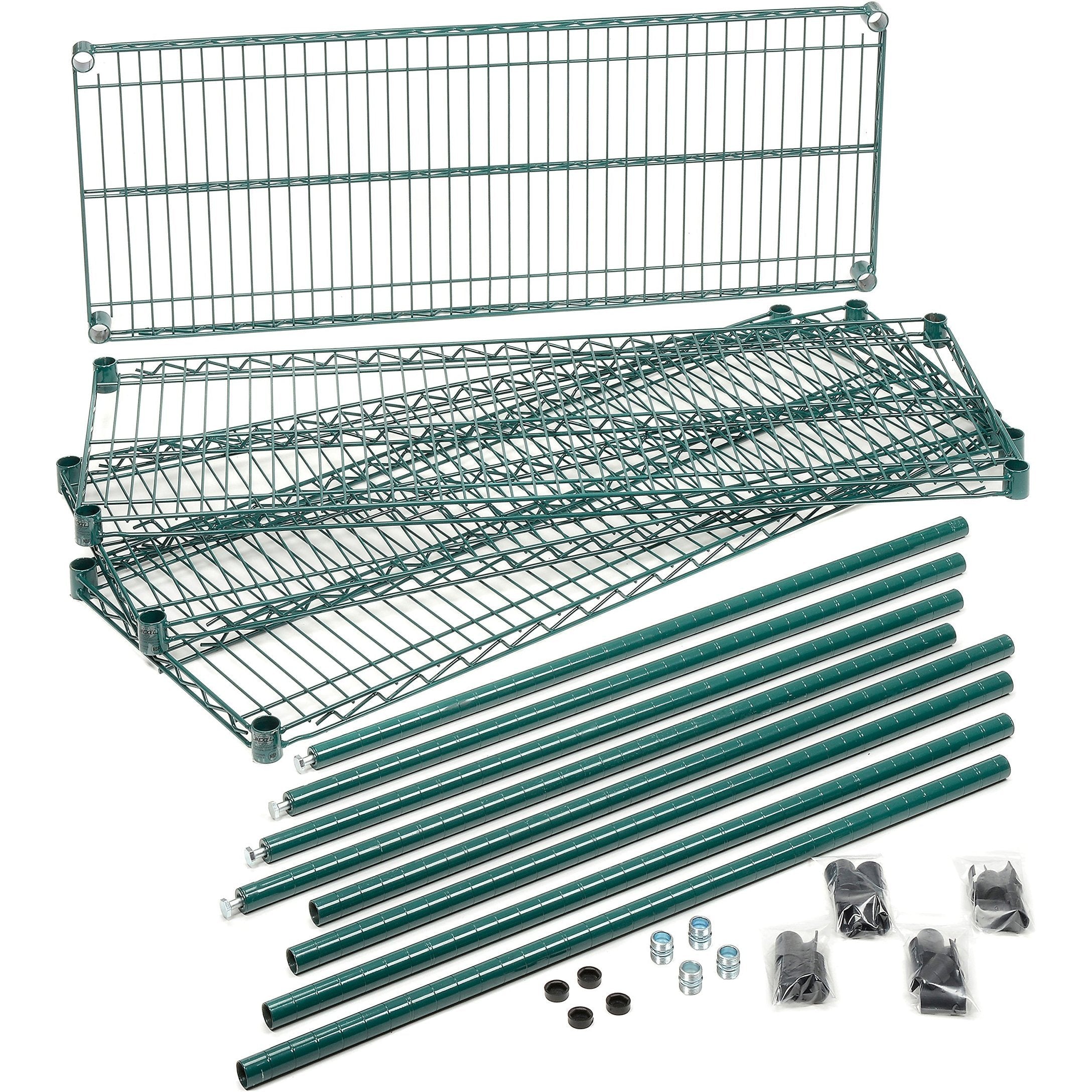 Nexel "798765 4-Shelf Wire Shelving Unit, 18"" W x 48"" L x 74"" H, Green" (VP18487G)4-Shelf Shelving Unit Dimensions: 18" x 48" x 74"Green Epoxy high performance finish is guaranteed against corrosion for 7 full years in wet or dry storage applicationsShelves easily adjust without tools and align accurately at 1" increments. Reinforced shelves with welded surface ribs for added strength, 400 lb shelf capacity.Open design maximizes air and light circulation and minimizes dust accumulation. 4 adjustable leveling feet (with non-marring floor glides) allow compensation for uneven floorsThe unique baked-on process bonds a green epoxy powder coat finish directly to the steel's surface resulting in an attractive, rugged and affordable shelving unit. This epoxy wire shelving is NSF approved for wet or dry use.