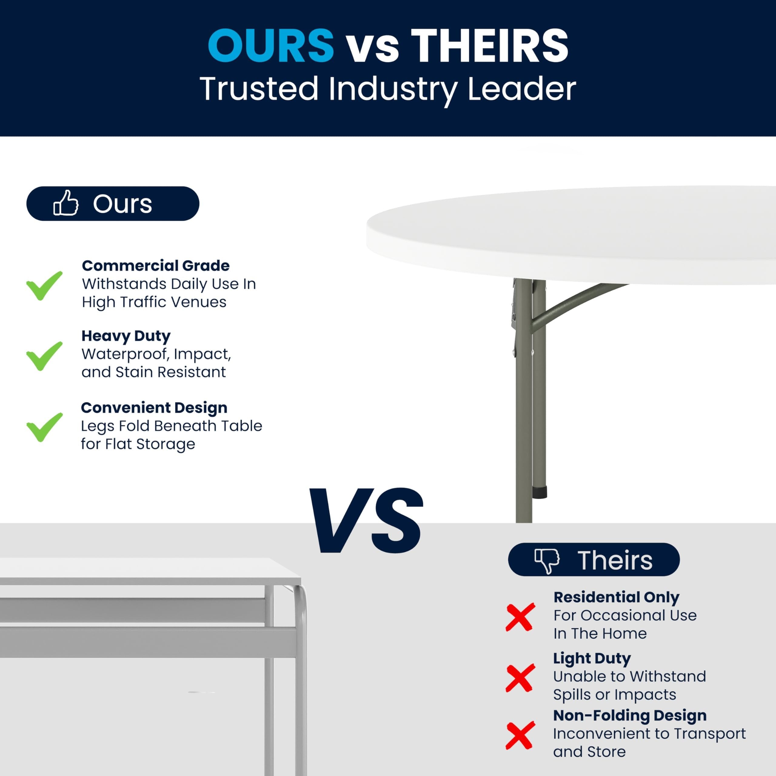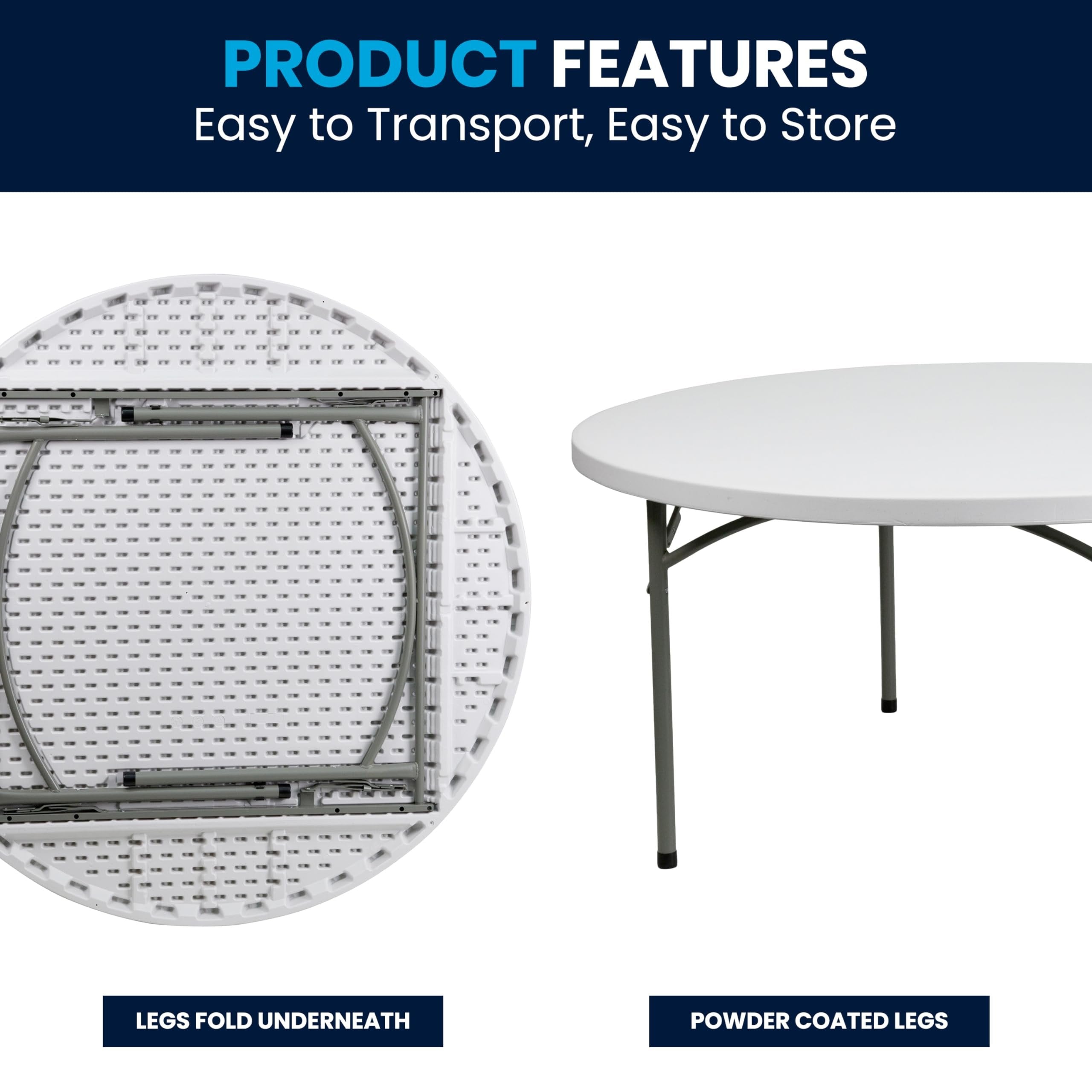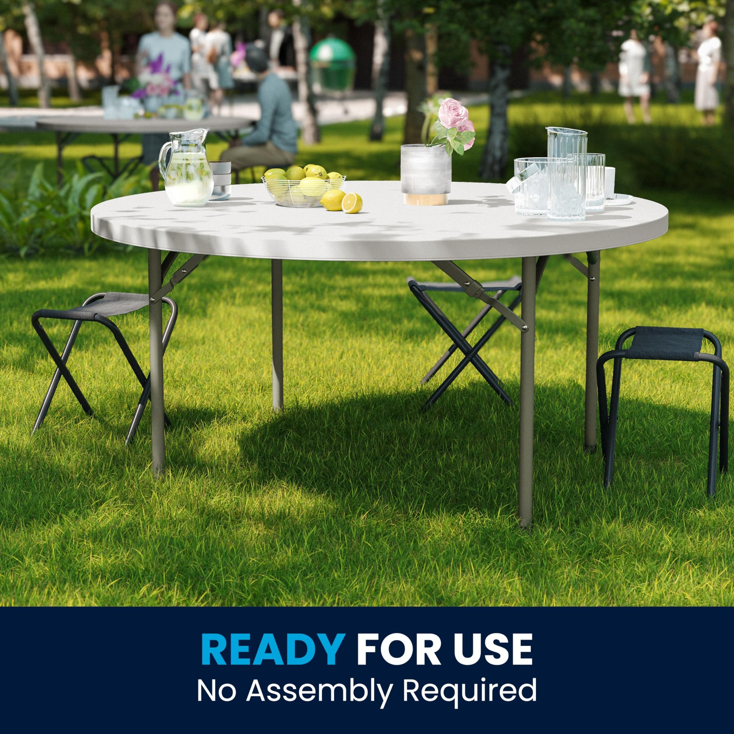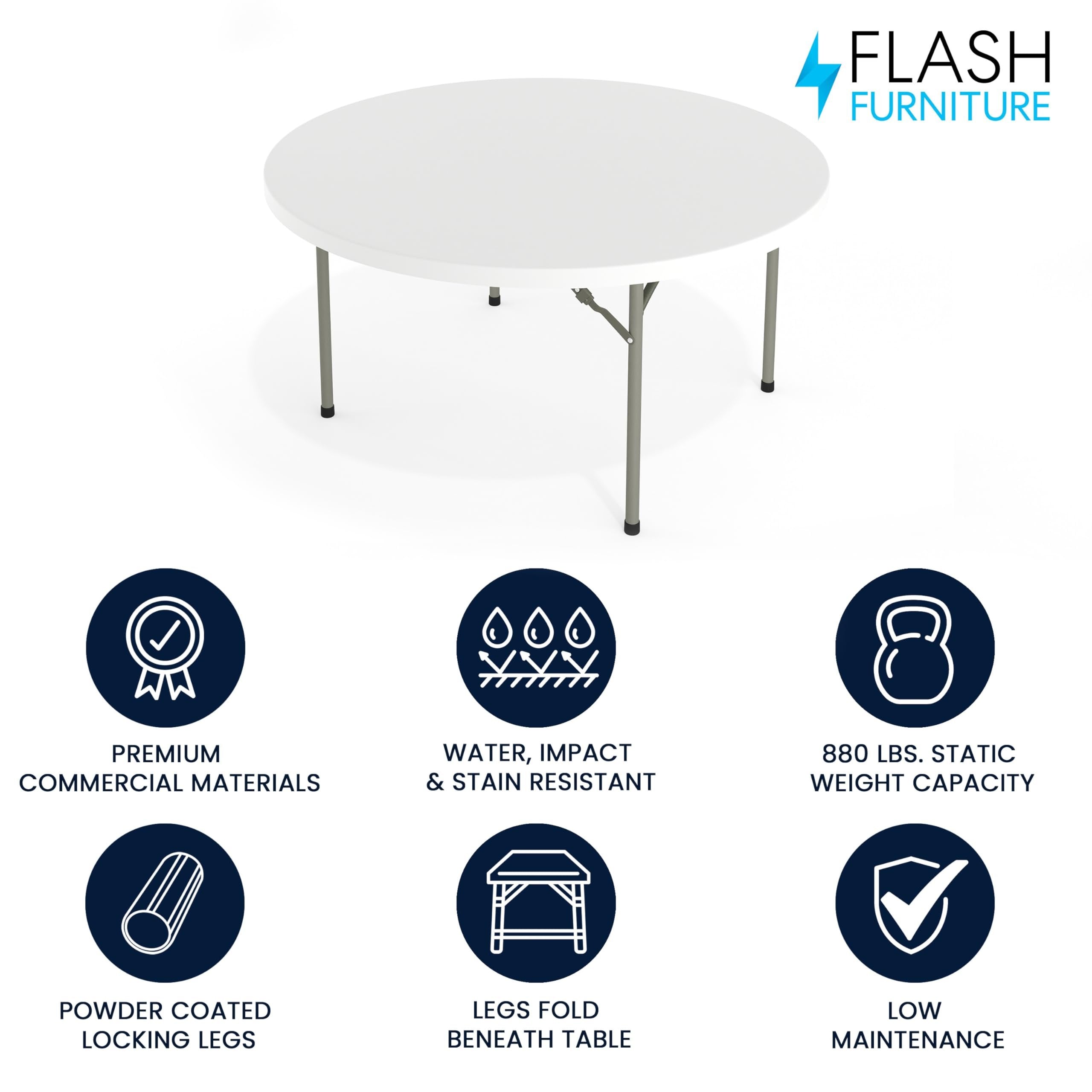 Flash Furniture 5' Round All-Occasion Plastic Folding Event Table for Parties and Trade Shows, Folding Banquet Table for Indoor/Outdoor Events, White5' ROUND FOLDING EVENT TABLE: Offers a reliable, on-demand solution for when you need a little extra surface space for your guests at indoor or outdoor home, school, or business eventsVERSATILE USES: Comfortably seats up to 8 people, making it great for a variety of settings such as parties, conferences, barbecues, trade shows, corporate events, training rooms, banquet venues, and much morePORTABLE DESIGN: Foldable table allows for easy transportation and compact storage, and the non-marring floor caps prevent your flooring surfaces from being damagedHIGH-QUALITY CONSTRUCTION: Made with a 2" thick waterproof and impact and stain-resistant tabletop and durable gray powder-coated locking legs to withstand years of quality use at indoor and outdoor eventsNO ASSEMBLY REQUIRED: Supports up to 880 lbs. of static weight and measures 59.75"W x 59.75"D x 28.75"H with no assembly required, so you can start setting up for events right away