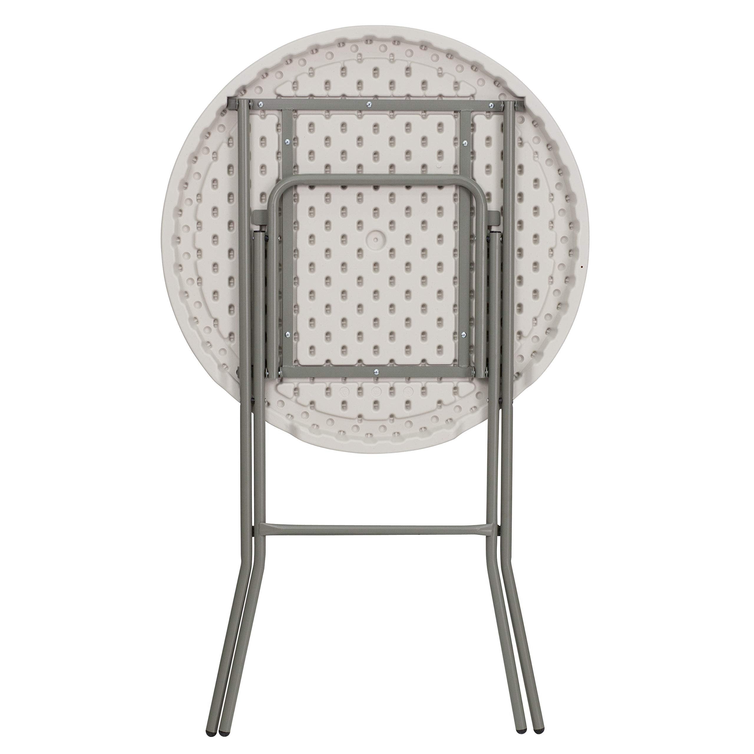Flash Furniture Kathryn 2.63' Round Folding Bar Height Table for Parties and Commercial Events, Indoor/Outdoor Plastic Bar Height Folding Table, White2.63' ROUND FOLDING BAR HEIGHT TABLE: Offers a reliable and convenient solution for when you need a mixing bar or a little extra surface space for your guests during home, school, or business eventsSEATS UP TO 3 PEOPLE: At 31.5" round with a 1.75" thick granite white tabletop, the table comfortably seats up to 3 adults to provide an ideal area for crafts, working on projects, or entertainingPORTABLE DESIGN: Non-locking gray powder-coated cross legs conveniently fold for easy transportation and storage, and the protective non-marring floor caps slide smoothly when you need to move the tableINDOOR OR OUTDOOR USE: Constructed from waterproof, impact and stain-resistant materials with a 165-lb. static load capacity to withstand years of quality use at indoor or outdoor eventsEASY TO CLEAN: Measures 31.5"W x 31.5"D x 43.5"H with no assembly required and can be wiped down with a damp cloth for easy cleaning as needed