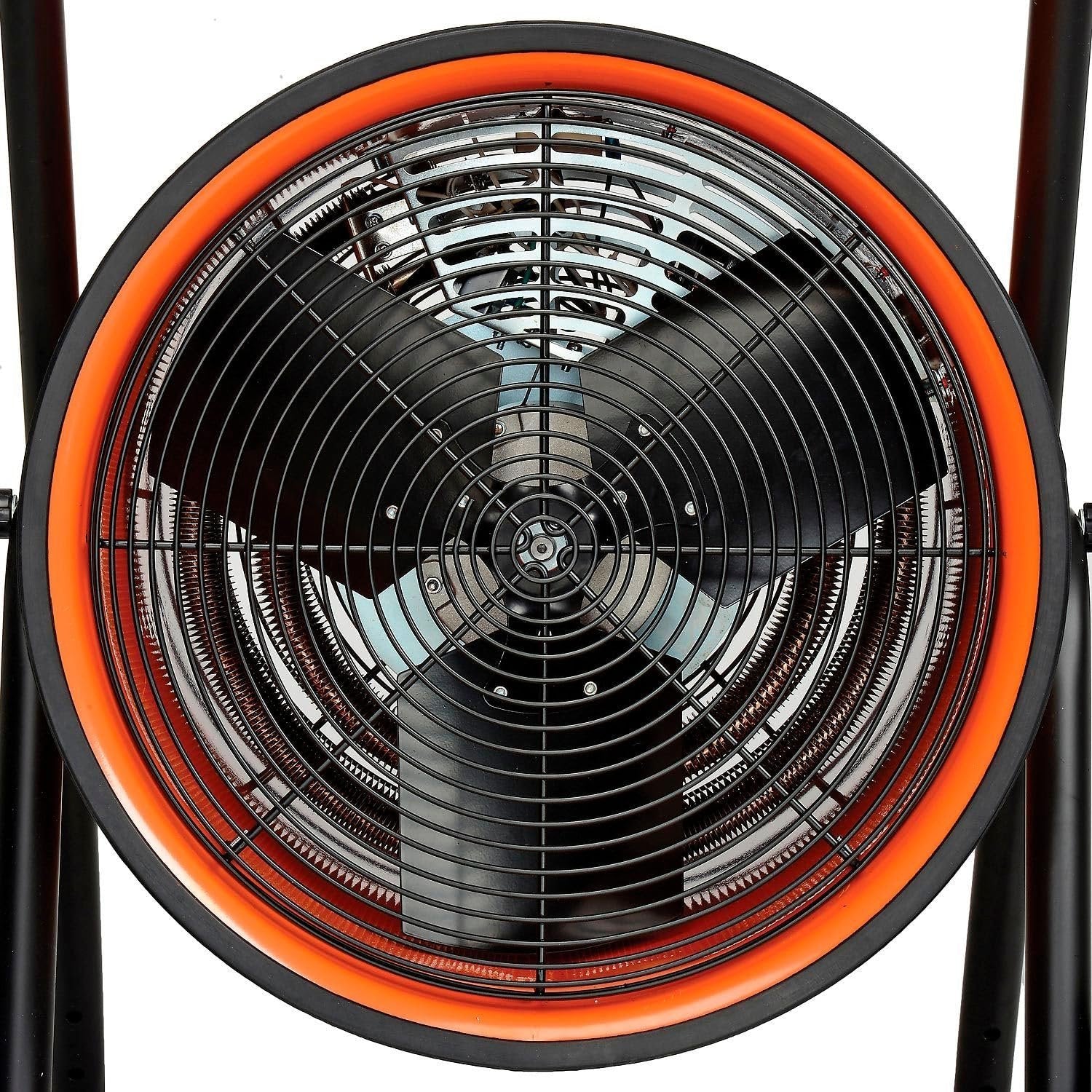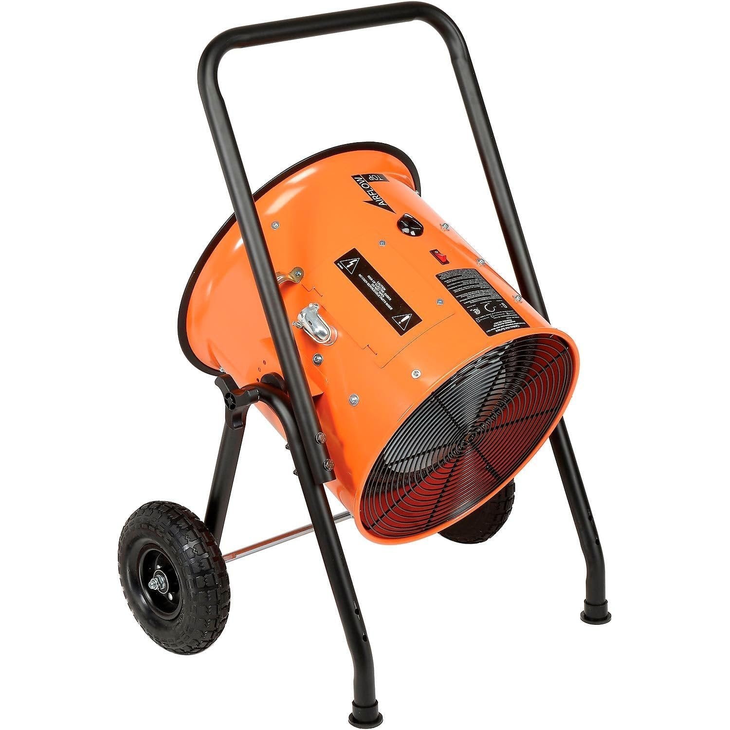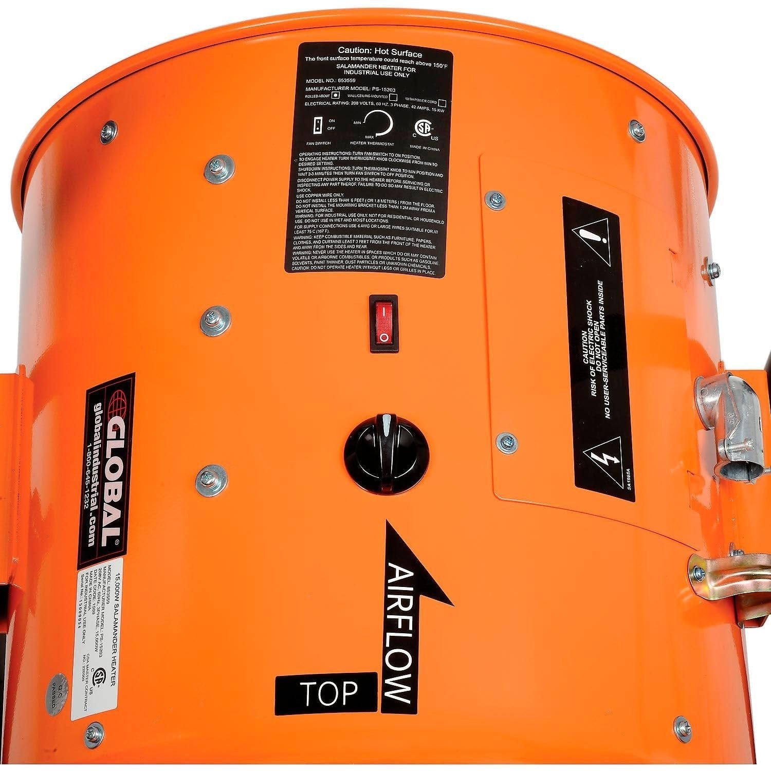 Heaters are electric and have finned tubular heating elements positioned in front of a fan unit to provide even distribution of heat. Electric heaters eliminate combustion byproducts associated with fuel-fired heaters. Tubular steel frame with ergonomic handle and hand screw allows for easy tilt adjustments & 10" wheels allow for easy movement of unit. On off switch and adjustable thermostat control knob are mounted on the top of the unit. High-limit thermal cutout switch provide ease of use. Requires 50 Amp circuit breaker. Salamander heaters are designed for direct wire installation. Access panel allows direct wiring connections. 25'L 6/4 SO type power cord is included. CSA & CSAus listed. Easy assembly of handle and wheels. , Lot of 1Moves up to 1500 CFM of hot air10" wheels allow for easy movementIdeal for industrial areas seeking temporary localized heat25'L 6/4 SO type power cord is includedAccess panel allows direct wiring connections