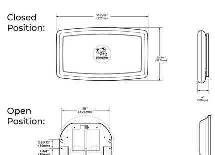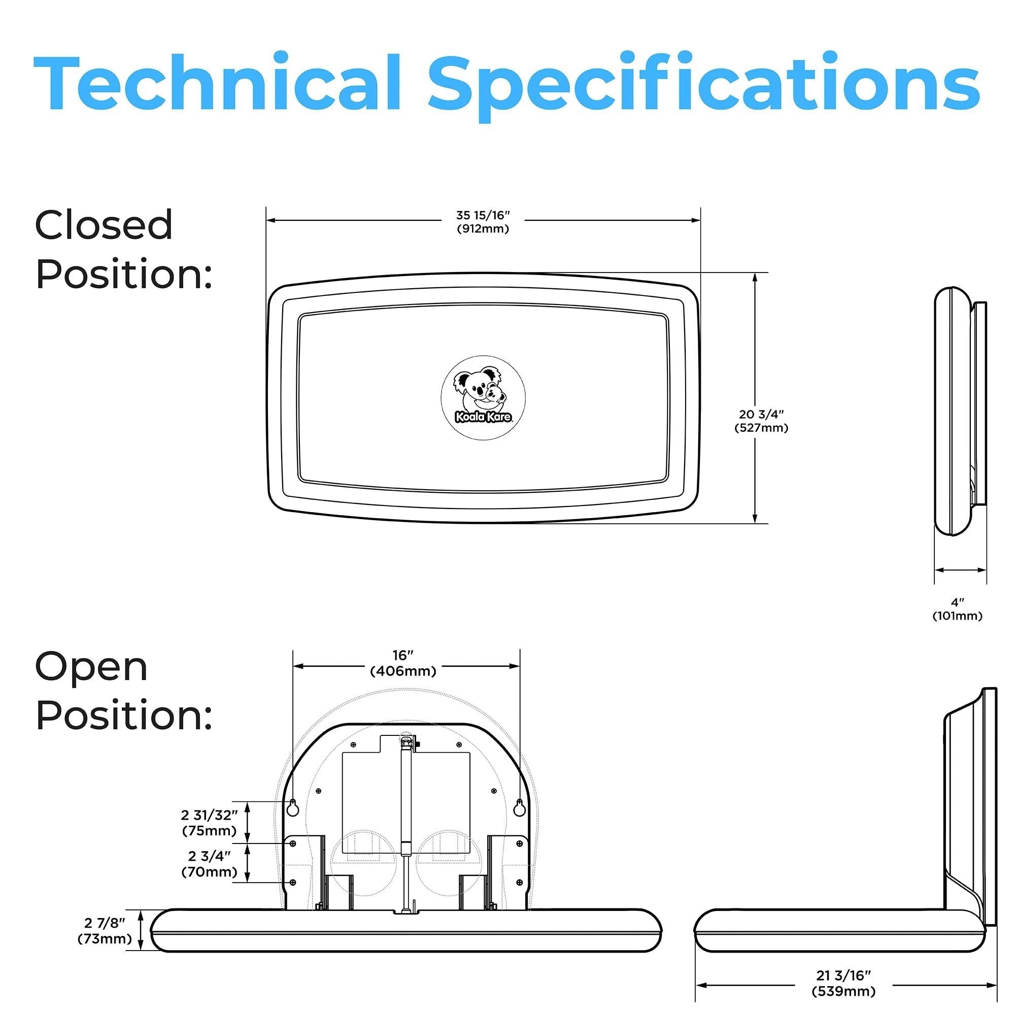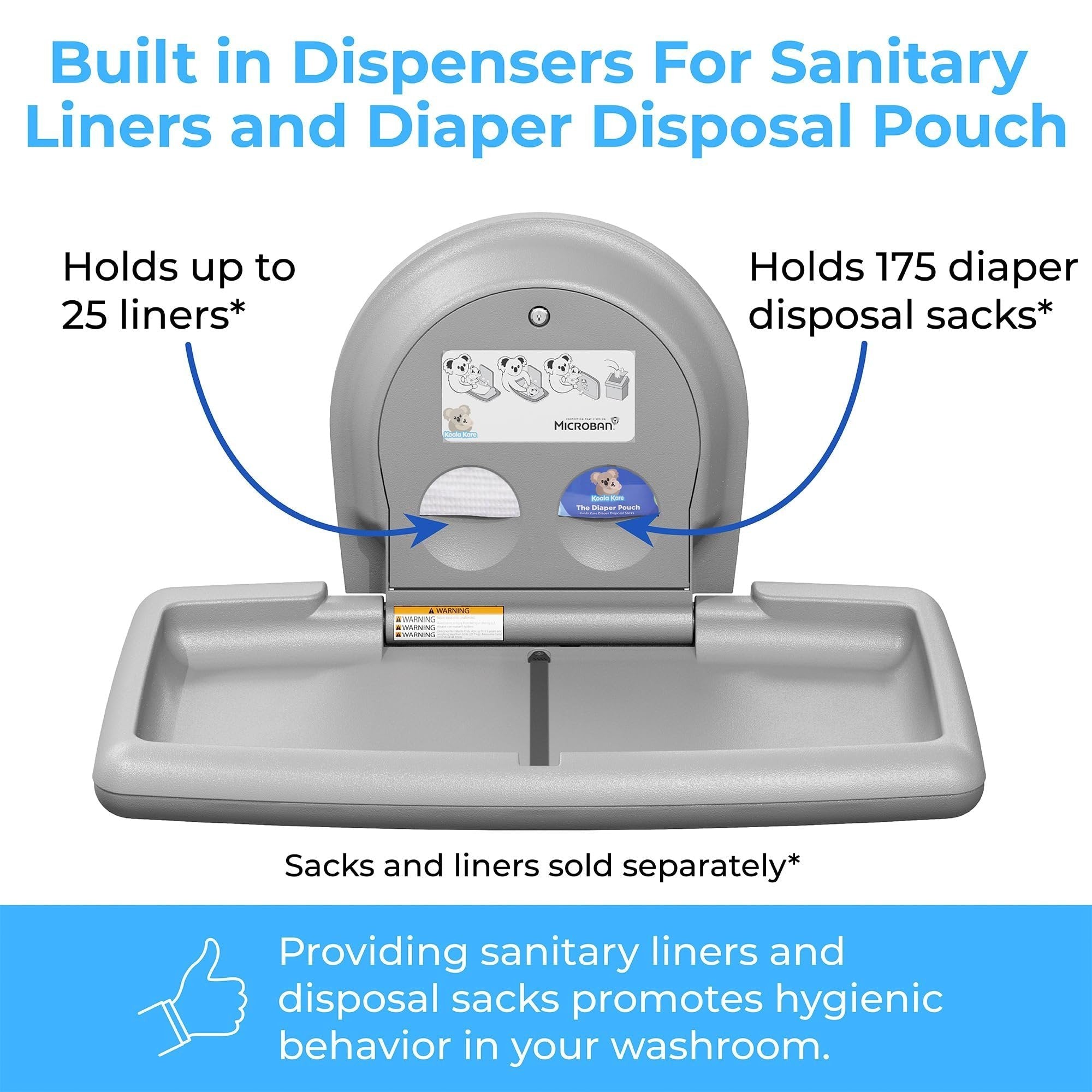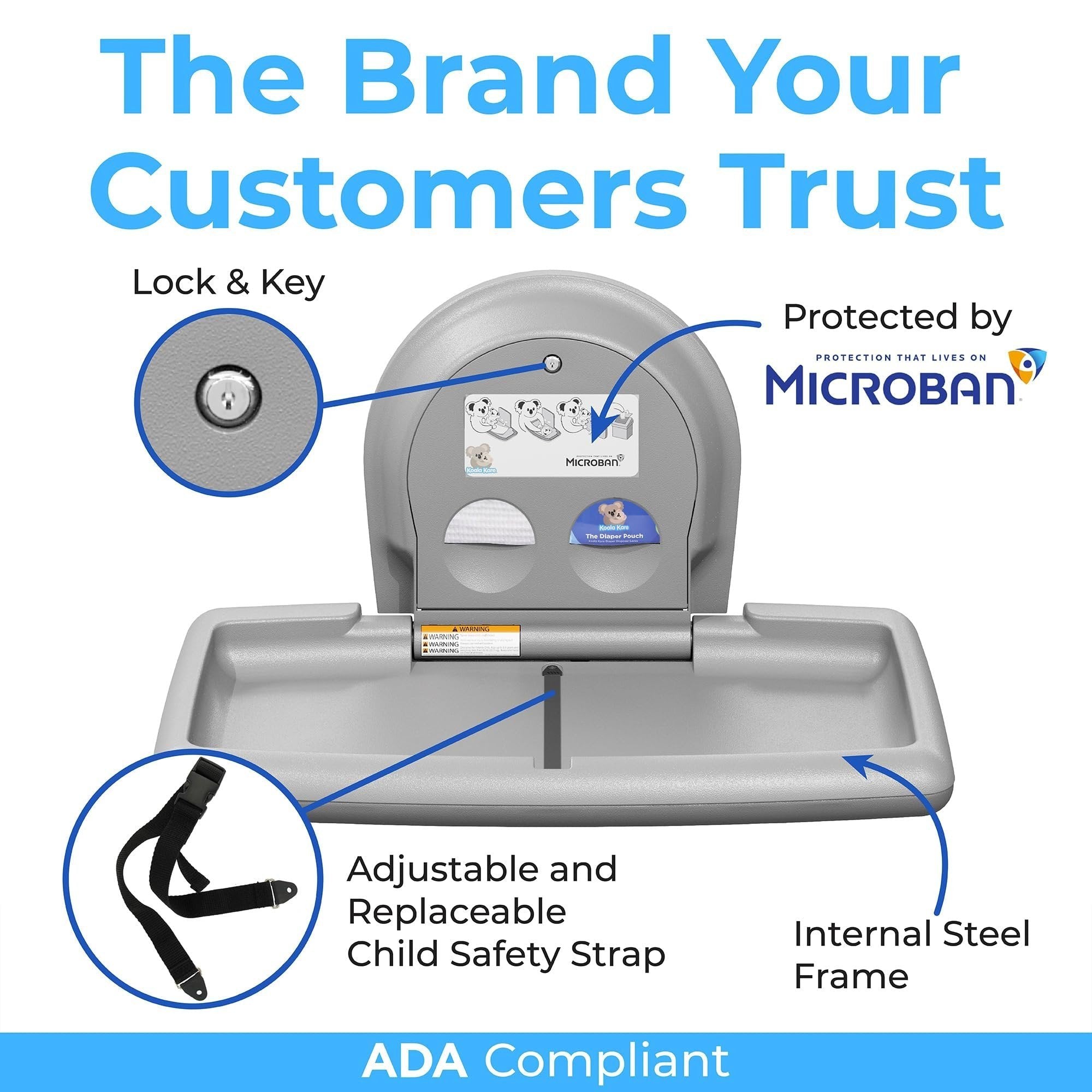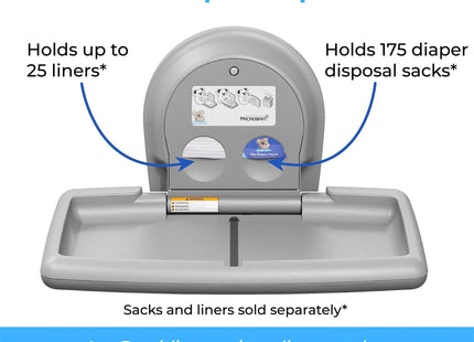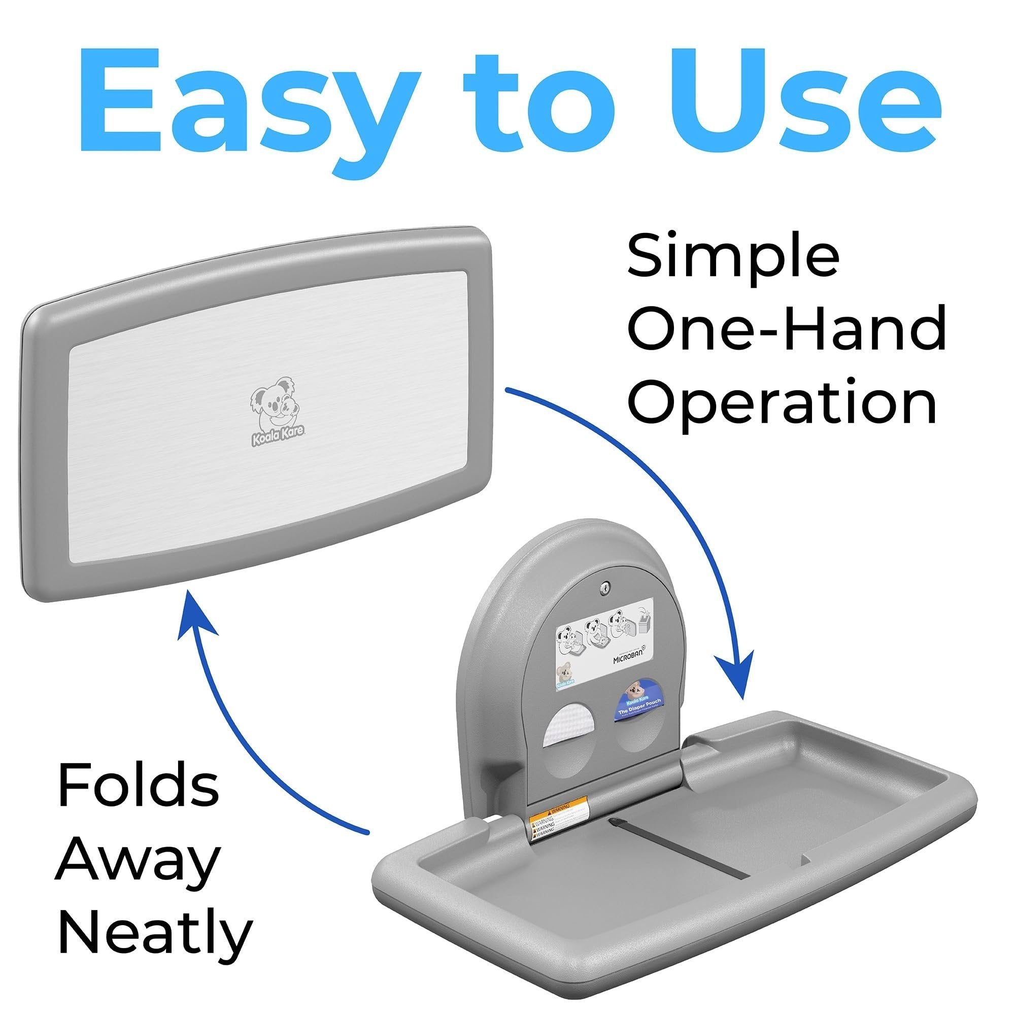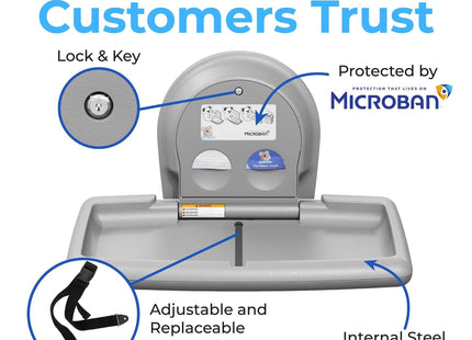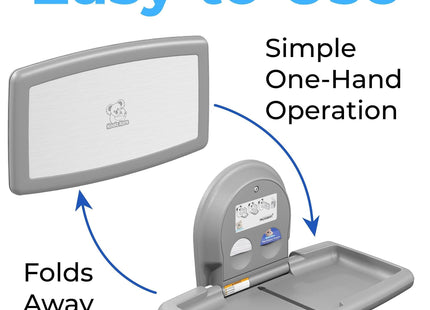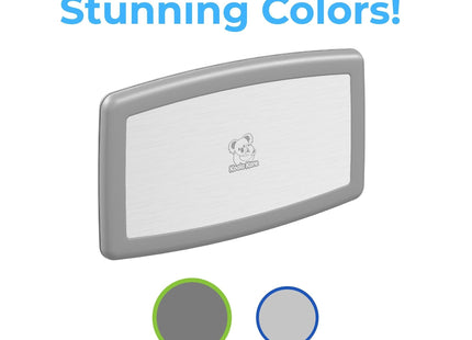 Koala Kare Surface-Mounted Horizontal Baby Changing Station with Stainless Steel Veneer, Model KB300-01SS (Grey)Superior Strength and Durability: This premium baby changing station is crafted with an internal steel frame and durable polypropylene plastic, ensuring longevity and resilience in high-traffic areas.Hygienic and Safe: Features Microban product protection to reduce odor. Child protection straps and a concealed pneumatic cylinder for smooth, controlled opening and closing for added safety during use.Complements modern restroom design and décor: Stainless Steel veneer with Grey or White Granite plastic body is a design upgrade that will give your restroom a more glamourous look.User-Friendly Convenience: Equipped with dispensers for easy access to sanitary liners and diaper disposal sacks. As well as a stainless bag hook that mounts on wall next to station for safe and easy access to diaper bags and purses.Koala Kare Promise: Since 1986, the Koala brand has been a promise of thoughtful accommodation to families.