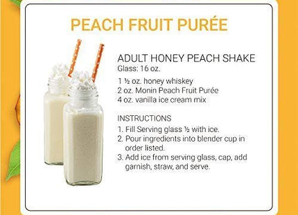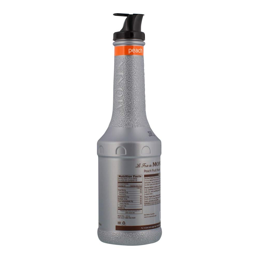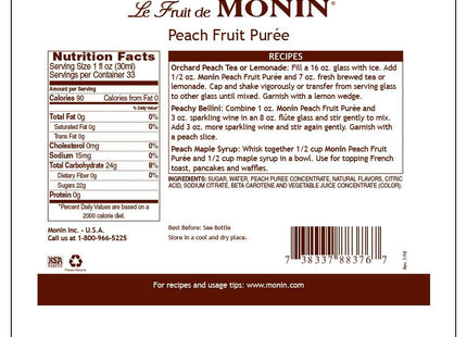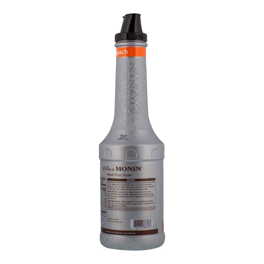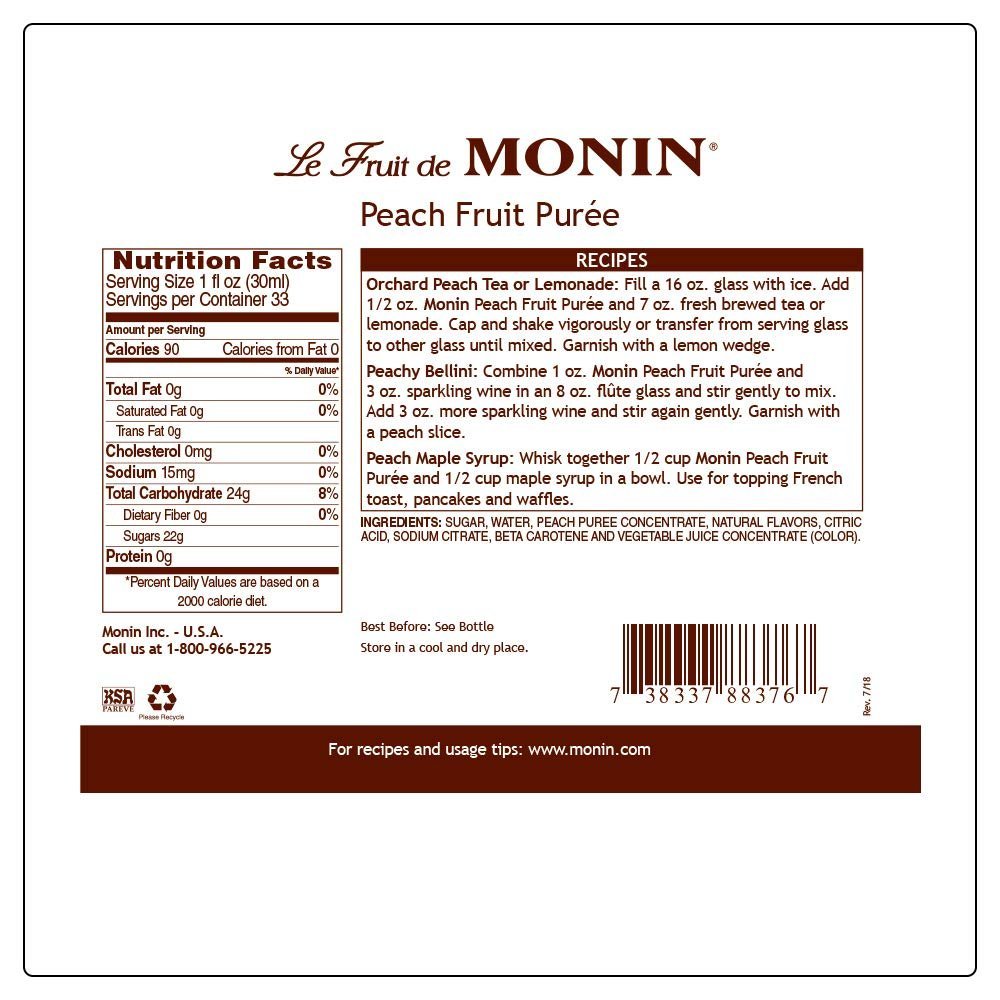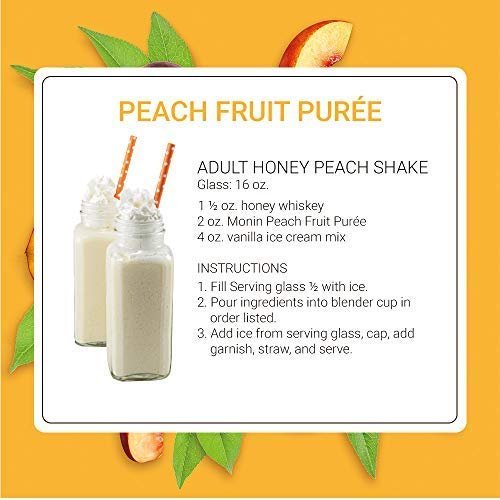 Monin - Peach Fruit Purée, Summertime Sweetness, Great for Cocktails, Smoothies, and Lemonades, Non GMO, No Artificial Ingredients (1 Liter)GREAT FOR COCKTAILS, SMOOTHIES, AND LEMONADES: When you bite into a soft, ripe peach, you immediately taste the sweetness of summer. Capture that juicy taste and texture when you use Peach Fruit Purée for smoothies and cocktails.TASTING NOTES: Sweet aroma and taste, akin to a tree-ripened summer peach; smooth texture; highly concentrated. Monin Peach Fruit Purée brings tree-ripened peach flavor to cocktails, lemonades, iced teas and smoothies.SPECIFICATIONS: Allergen Free, Contains Real Fruit, Dairy Free, Gluten Free, Halal, Kosher, No Artificial Colors, No Artificial Flavors, No Artificial Ingredients, No Artificial Preservatives, No Artificial Sweeteners, Non-GMO, Vegan, & Clean LabelSYRUP TO SUPPORT BEE COLONIES: Colony Collapse Disorder is greatly reducing bee populations worldwide. Our syrup recycling initiative has been sending waste syrup to feed bees since 2008, and has fed over 374 billion bees!GREEN PACKAGING & LABELING: With BPA free bottles, 100% recyclable boxes comprised of 30% recycled content, printed with biodegradable water-based ink containing zero pollutants, and pulp inserts, we’re doing our part for the environment.