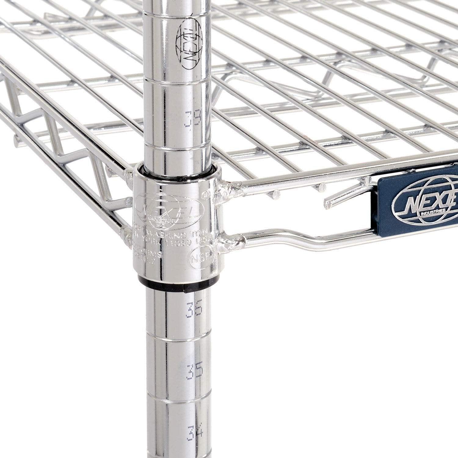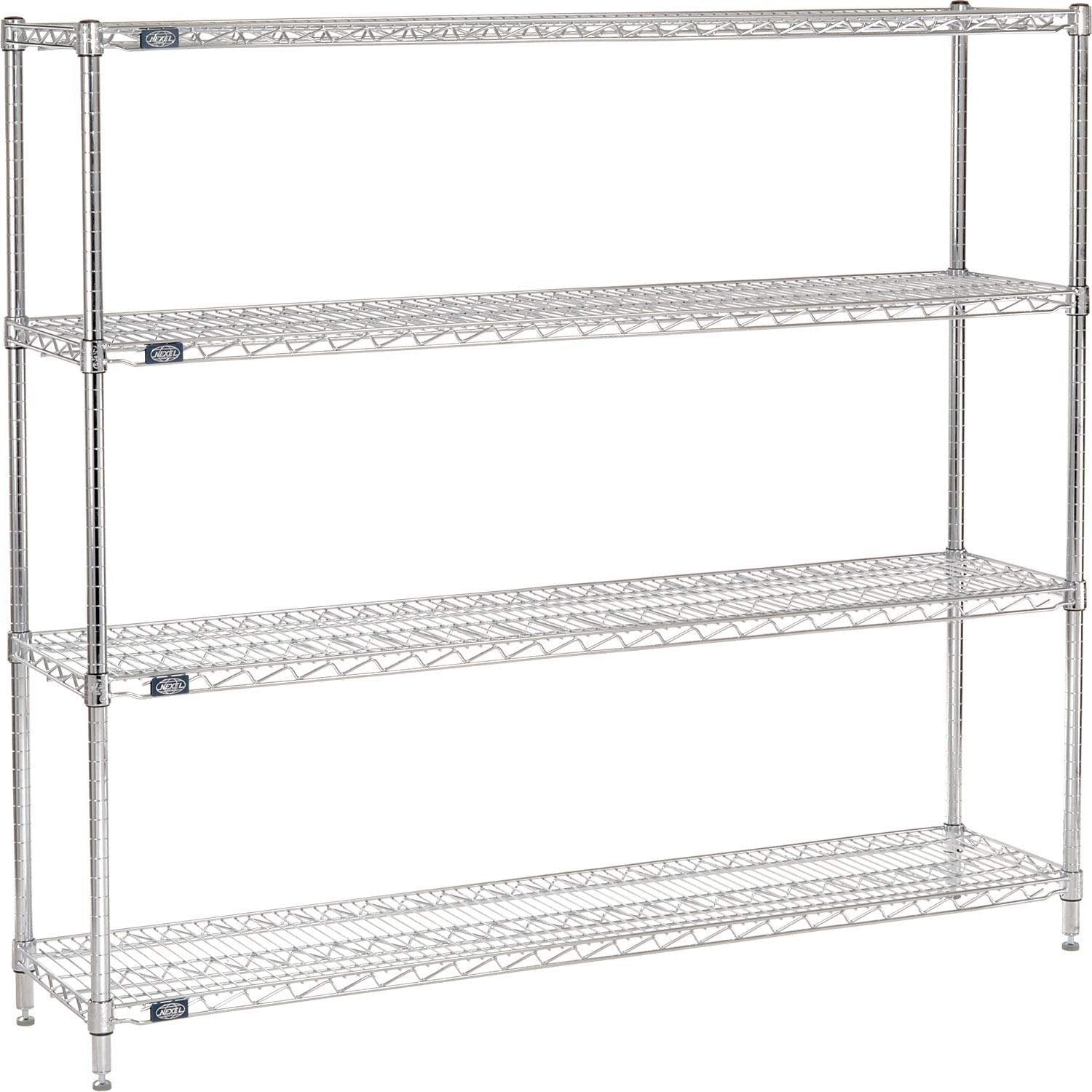 Nexel Adjustable Wire Shelving Unit, 4 Tier, Commercial Dry Storage Rack, 14" x 60" x 63", Chrome4-Shelf Shelving Unit Dimensions: 14" x 60" x 63"4-Shelf Shelving Unit Dimensions: 14" x 60" x 63"Our chrome finish is electro-plated nickel-chrome resulting in a brilliant high gloss finish. It is a quality finish that is both hard and durable with a high tech look at an economical price.This wire shelving rack is the industry standard and perfect for retail display and dry storage usePoly-GreenShelves easily adjust without tools and align accurately at 1" increments. Shelf clips snap on post, allowing shelf collar to slide over for a secure fit. Reinforced shelves with welded surface ribs for added strength, 600-800 lb shelf capacity.