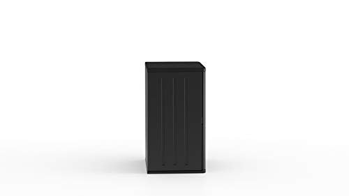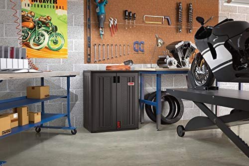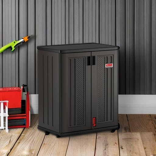 Suncast Commercial Heavy-Duty 9 Cubic Ft. Resin Storage Cabinet with Lockable Handles, Adjustable Metal-Reinforced Shelves for Garage or Workspace, Black, Made in The USAGARAGE STORAGE CABINET: Keep your tools, supplies, and equipment organized and secure with this versatile storage solution, perfect for garages, workshops, or professional environmentsSTURDY SHELVING SYSTEM: Features two adjustable, metal-reinforced shelves, each designed to support up to 200 lbs., ensuring reliable storage for heavy-duty tools and materialsHIGHLY DURABLE CONSTRUCTION: Made from multi-wall resin panels that resist rust, dents, and warping, this cabinet is built to withstand tough conditions and provide long-term useSECURE LOCKING MECHANISM: Equipped with built-in handles that are padlock-compatible (padlock not included), offering added security to protect your valuable itemsSPACE-SAVING DESIGN: Compact dimensions of 36" H x 30" W x 20.25" D, making this garage organizational cabinet ideal for maximizing storage in smaller spaces while maintaining a sleek and professional appearance