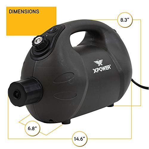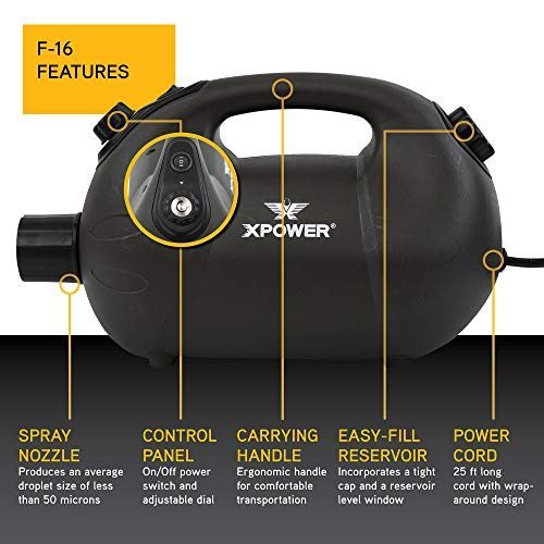 XPOWER F-16 ULV Cold Fogger, Mist Blower, and Sprayer for Cleaning, Disinfecting, Pest Control, Odor Elimination, and Mold Removal, 30+ Ft. Spray Distance, 1.6 L Tank Capacity, 2 SpeedsKEY BENEFITS – Wide-area solution application is practical with an XPOWER F-16 ULV cold fogger. Save time, use less solution, and get better results.HIGH-PERFORMANCE – Maximum coverage and effectiveness, and minimal dampness and solution used, thanks to the fogger’s powerful motor and extremely small droplets.CONVENIENT – Easy-to-fill reservoir and reservoir level window helps monitor your liquid levels, with 2 motor speeds available. Lightweight and durable PP housing.FULL COVERAGE – Spray distance of 30+ ft. and average droplet size < 50 microns, with 25 ft. power cord and 1.6 L tank capacity.SAFETY & SERVICE STANDARDS – ETL / CETL safety certified and comes with a 1-year limited warranty. XPOWER’s California-based customer service team offers comprehensive support, assuring a first-class customer experience.